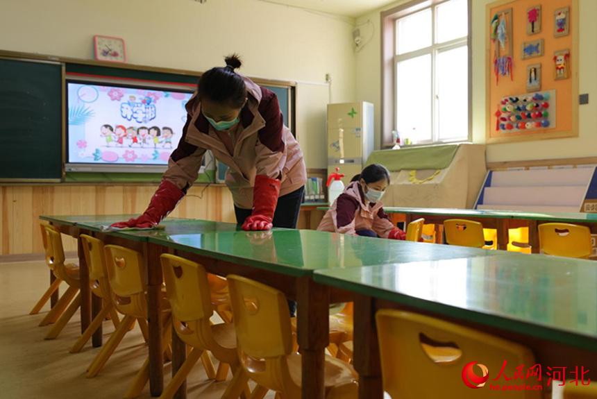 河北省邢臺市廣宗縣第一幼兒園,教職工在對教室進(jìn)行清潔消毒。 王壘攝