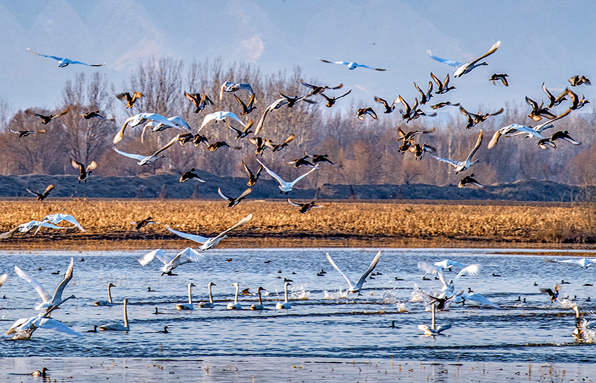 隨著天氣漸暖,棲息在山西省運城市萬榮縣黃河濕地越冬的白天鵝十分活躍,它們在濕地或飛翔、或覓食、或嬉戲,為一年一度的遷徙做準(zhǔn)備,吸引眾多游客前來觀賞。