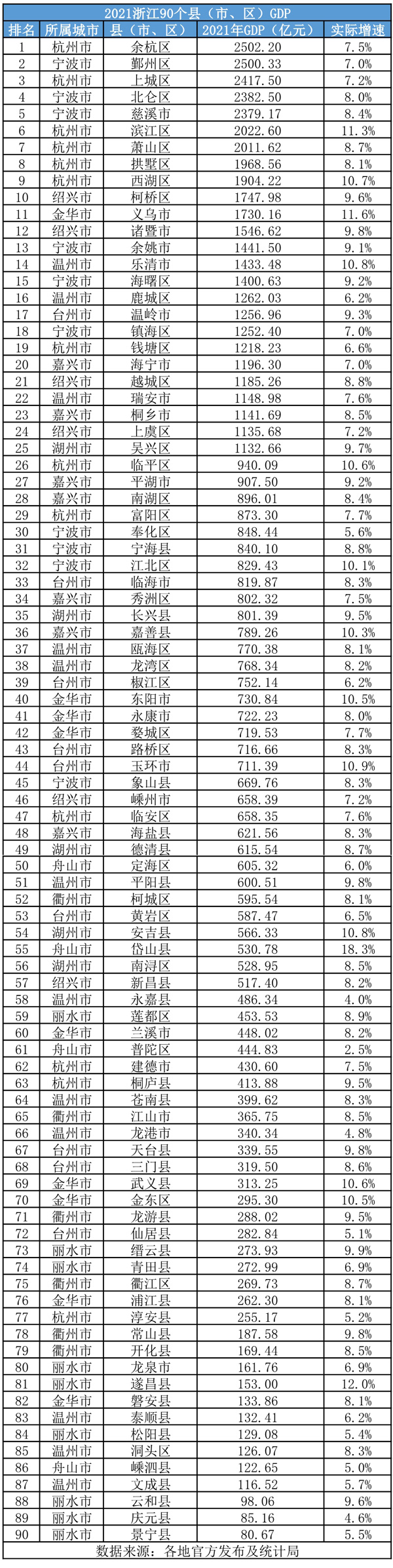 近日,全國兩會召開,浙江提出將以共同富裕示范區(qū)建設機制創(chuàng)新年、改革探索年、成果展示年為引領,扎實推動共同富裕美好社會建設。作為承上啟下的重要節(jié)點,縣域經濟的發(fā)展情況關系到能否實現(xiàn)共同富裕。那么2021年,浙江各縣(市、區(qū))經濟運行情況如何?人民網浙江頻道對全省90個縣(市、區(qū))2021年主要經濟數(shù)據(jù)進行梳理,共有25個縣(市、區(qū))GDP超千億元,突破2000億元大關的縣(市、區(qū))更是從2020年的5個擴容至7個。
