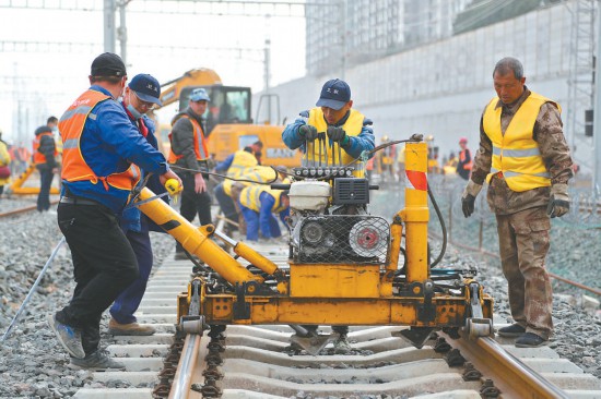 昨天上午,豐臺站改建工程計算機聯鎖封鎖施工、撥線施工開始,七百余名施工人員同時作業(yè)保障工程順利完成。本報記者 安旭東攝