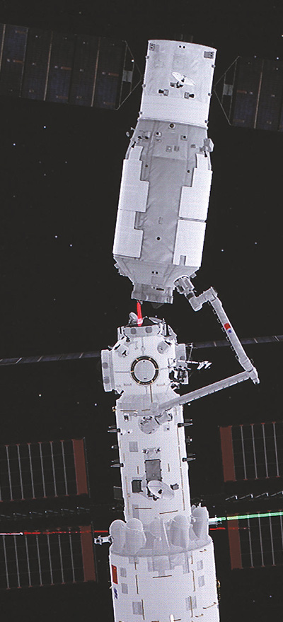 在北京航天飛行控制中心拍攝的空間站機(jī)械臂轉(zhuǎn)位貨運(yùn)飛船試驗(yàn)畫面,天舟二號貨運(yùn)飛船在機(jī)械臂拖動(dòng)下,以核心艙節(jié)點(diǎn)艙球心為圓心進(jìn)行平面轉(zhuǎn)位。