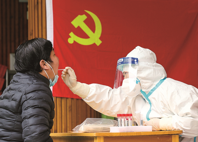 南京一處核酸檢測(cè)點(diǎn),黨旗高懸。 本報(bào)記者 陳儼 攝