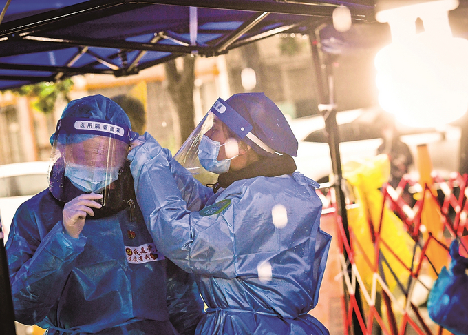 3月20日,南京雨花臺(tái)區(qū)梅欣西區(qū)廣場(chǎng)核酸檢測(cè)采樣點(diǎn),雨中堅(jiān)守的志愿者互相整理起霧的防疫裝備。 本報(bào)記者 萬(wàn)程鵬 攝