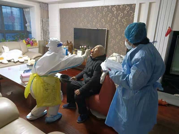 孫麗群(右)與醫(yī)護(hù)人員一同上門為居家老人做核酸檢測(cè)。受訪者供圖