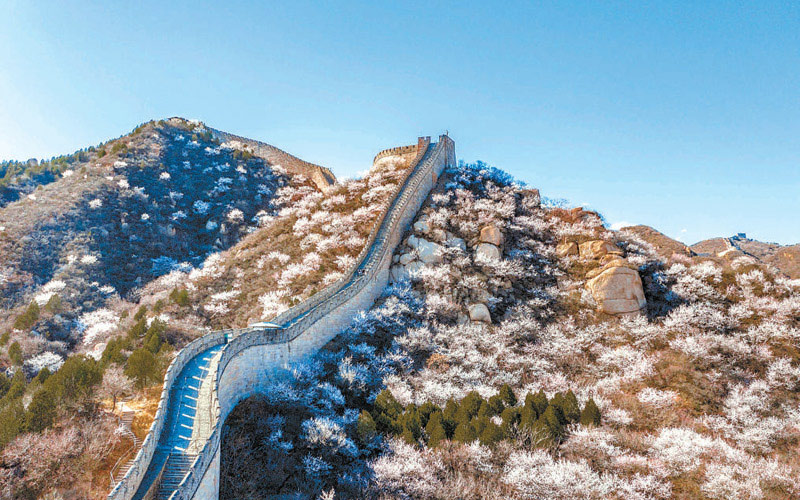 昨天天朗氣清,爛漫的山花將蜿蜒的水關(guān)長城裝點(diǎn)得分外妖嬈。本報(bào)記者 潘之望攝