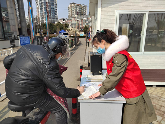 遷安市委組織部年輕黨員李洋在頤秀園小區(qū)卡口執(zhí)勤。 遷安市委宣傳部供圖