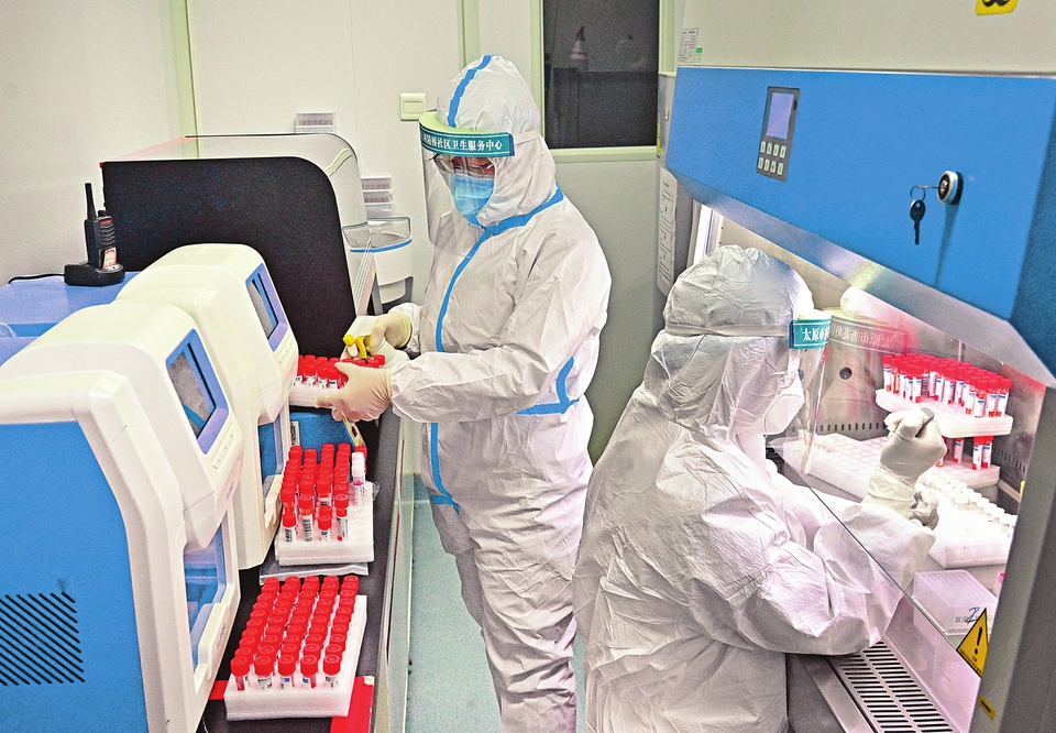 在太原市杏花嶺區(qū)壩陵橋社區(qū)衛(wèi)生服務中心PCR室,醫(yī)務人員正在對采集樣本進行新型冠狀病毒核酸檢測。 記者劉通攝