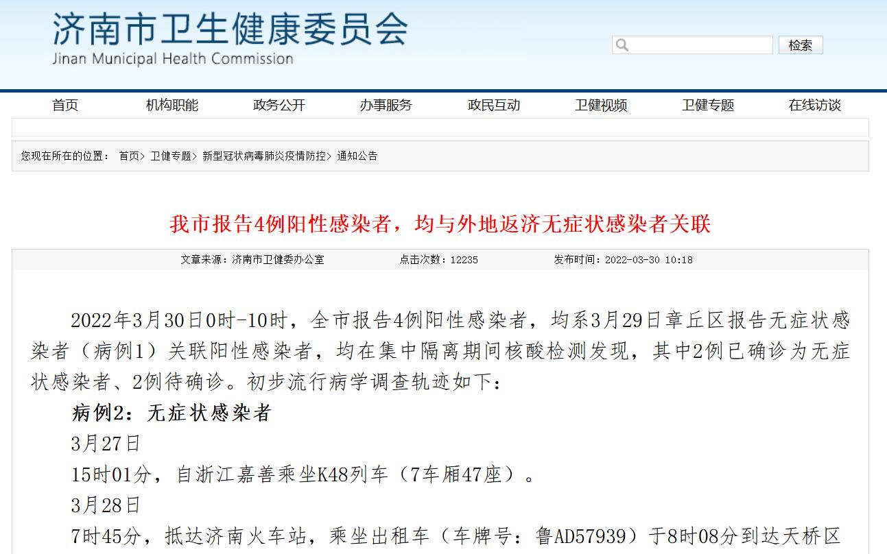 濟南市報告4例陽性感染者,均與外地返濟無癥狀感染者關(guān)聯(lián)