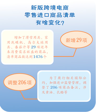 此次調(diào)整,在《跨境電子商務(wù)零售進口商品清單(2019年版)》基礎(chǔ)上,增加了滑雪用具、家用洗碟機、高爾夫球用具、番茄汁等29項近年來消費需求旺盛的商品,涉及食品、家用電器、運動用品等多類別,清單商品數(shù)達到1476個。