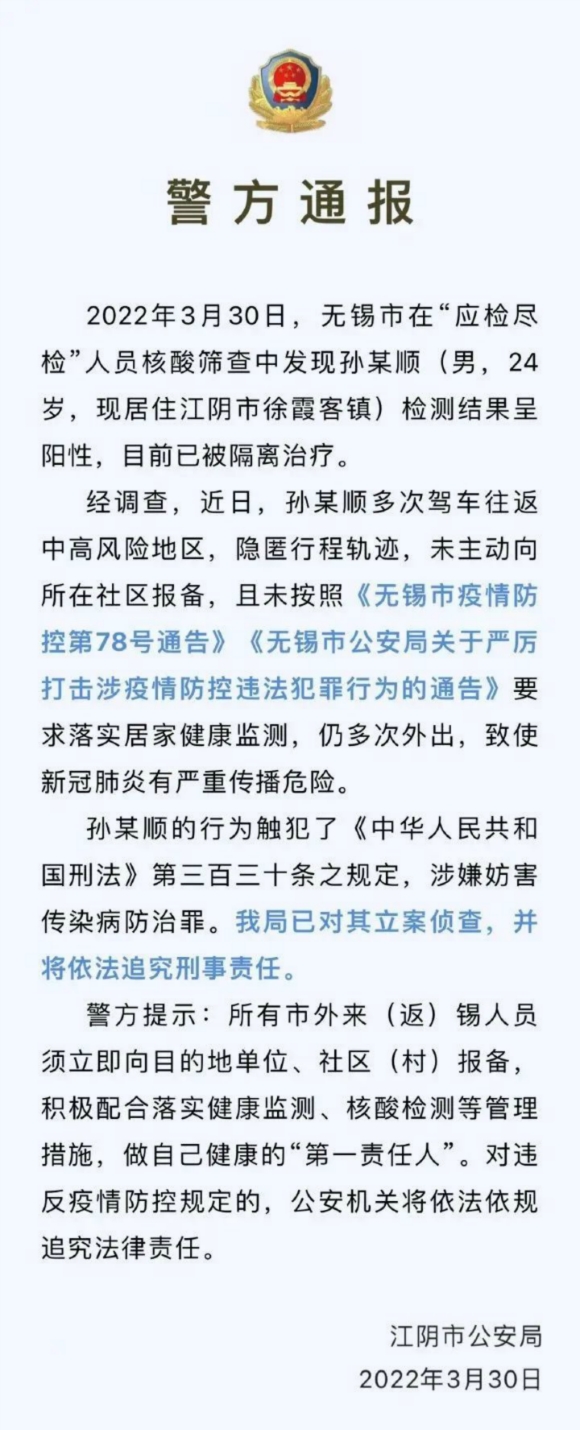 江蘇無(wú)錫一陽(yáng)性男子故意隱匿行程軌跡被刑事立案