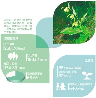 近年來,各地各部門持續(xù)開展退耕還林還草、巖溶地區(qū)石漠化綜合治理、水土流失綜合治理等重點(diǎn)生態(tài)工程建設(shè)。據(jù)統(tǒng)計(jì),工程區(qū)完成人工造林268.70萬公頃、封山育林196.61萬公頃、低效林改造174.39萬公頃,森林覆蓋率達(dá)68.6%;工程區(qū)65個(gè)重點(diǎn)治理縣累計(jì)治理石漠化土地62萬公頃,石漠化土地面積減少約40萬公頃。