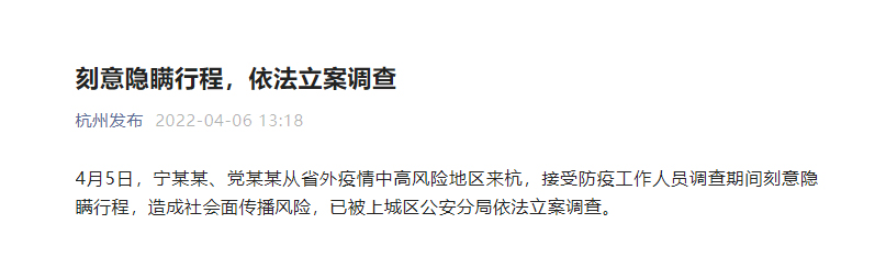 人民網(wǎng)杭州4月6日電 (艾宇韜)據(jù)杭州市新冠肺炎疫情防控指揮部最新消息,4月5日,兩名從省外疫情中高風(fēng)險地區(qū)來杭人員寧某某、黨某某,在接受杭州防疫工作人員調(diào)查期間刻意隱瞞行程,造成社會面?zhèn)鞑ワL(fēng)險,目前已被杭州市上城區(qū)公安分局依法立案調(diào)查。
