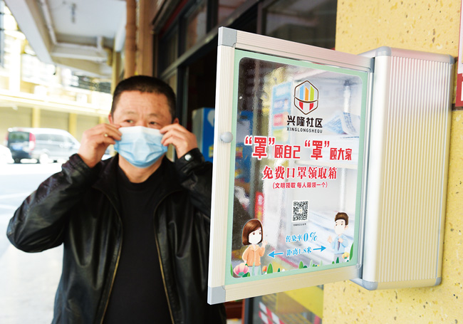 近日,浙江義烏福田街道興隆社區(qū)在轄區(qū)內(nèi)主干道出入口、人員密集的超市、藥店、快遞點(diǎn)等地設(shè)置免費(fèi)口罩領(lǐng)取箱,箱里放滿了口罩,箱體上寫著“文明領(lǐng)取,每人限領(lǐng)一個(gè)”?;顒?dòng)開展半個(gè)月以來,6個(gè)免費(fèi)口罩領(lǐng)取箱共送出近6000個(gè)口罩。興隆社區(qū)黨委書記黃俊鋼表示,除了設(shè)立免費(fèi)口罩領(lǐng)取箱,社區(qū)還大力開展佩戴口罩勸導(dǎo)活動(dòng)。(錢旭升)