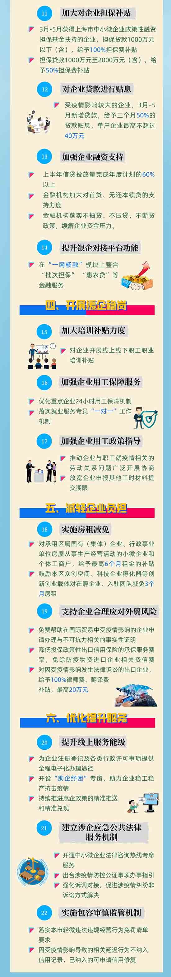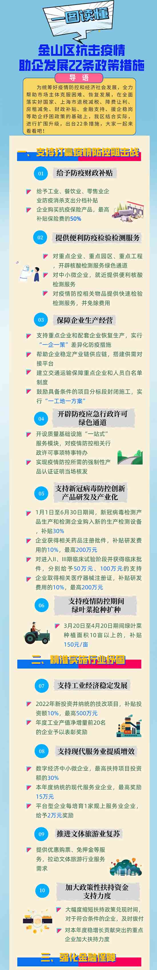 據(jù)悉,為統(tǒng)籌好疫情防控和經(jīng)濟(jì)社會發(fā)展,全力幫助市場主體克服困難、恢復(fù)發(fā)展,在全面落實好國家、上海市退稅減稅、降費讓利、房租減免、財政補貼、金融支持、援企穩(wěn)崗等助企紓困政策的基礎(chǔ)上,結(jié)合金山實際,進(jìn)行擴(kuò)圍升級,制訂《金山區(qū)抗擊疫情助企發(fā)展22條政策措施》。“22條”既聚焦企業(yè)當(dāng)前面臨的“難點”“痛點”“堵點”,又考慮到疫情后企業(yè)加快發(fā)展的各項訴求,共計包括六大方面內(nèi)容,即支持打贏疫情防控阻擊戰(zhàn)、精準(zhǔn)實施行業(yè)紓困、強化金融保障、開展援企穩(wěn)崗、減輕企業(yè)負(fù)擔(dān)及優(yōu)化提升服務(wù),用實實在在的舉措,精準(zhǔn)幫助市場主體紓困解難,穩(wěn)定經(jīng)濟(jì)增長。
