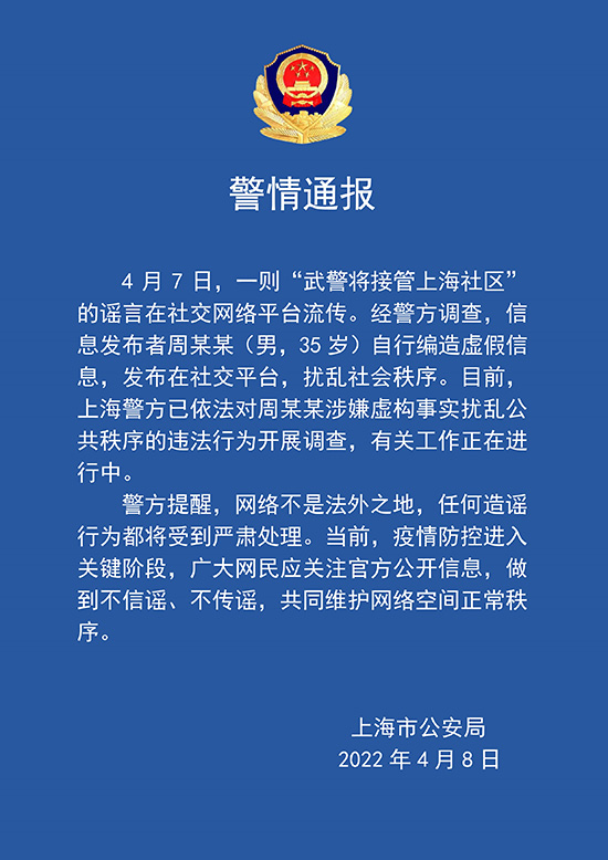 人民網(wǎng)上海4月8日電(王文娟)據(jù)上海市公安局通報(bào):4月7日,一則“武警將接管上海社區(qū)”的謠言在社交網(wǎng)絡(luò)平臺流傳。經(jīng)警方調(diào)查,信息發(fā)布者周某某(男,35歲)自行編造虛假信息,發(fā)布在社交平臺,擾亂社會秩序。目前,上海警方已依法對周某某涉嫌虛構(gòu)事實(shí)擾亂公共秩序的違法行為開展調(diào)查,有關(guān)工作正在進(jìn)行中。