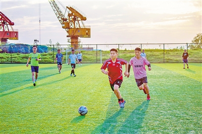 4月9日,在利用廢舊碼頭改造而成的安徽省銅陵市濱江生態(tài)體育公園,足球愛好者競逐綠茵,不遠處的碼頭吊臂高高矗立。近年來,各地注重盤活城市空閑土地,通過新建或改擴建體育公園、公共體育場館等,加大全民健身場地設施供給。