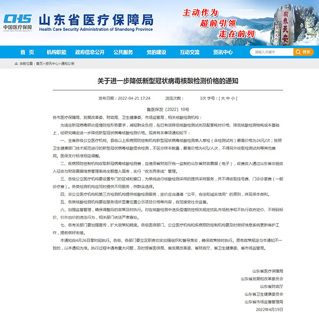 為適應(yīng)新冠病毒肺炎疫情防控形勢要求,減輕群眾負(fù)擔(dān),在已有效降低核酸檢測試劑及配套耗材價格、降低核酸檢測物耗成本基礎(chǔ)上,進(jìn)一步降低新型冠狀病毒核酸檢測價格。山東省各級公立醫(yī)療機(jī)構(gòu)、縣級以上疾病預(yù)防控制機(jī)構(gòu)新型冠狀病毒核酸檢測單人單檢(含檢測試劑)最高價格為24元/次;按照衛(wèi)生健康部門技術(shù)規(guī)范進(jìn)行的新型冠狀病毒核酸混合檢測,不區(qū)分樣本數(shù)量,最高價格為4元/人次,不得另外收取檢測試劑等其他費(fèi)用。