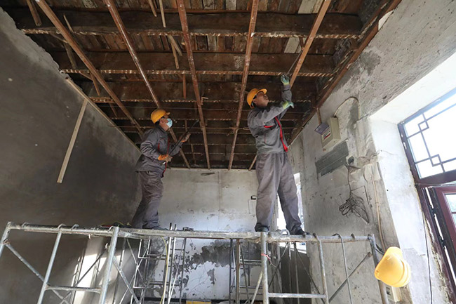 按照計劃,樓頂將由原來的木質(zhì)大屋脊整體更換為樹脂瓦阻燃屋面。而在第一階段改造中,樓體阻燃,為居民量身訂制燃氣柜,配備24小時巡護“管家”,每天進行巡查記錄并拍攝現(xiàn)場照片均已完成。一層的臨街房屋內(nèi)的夾層已經(jīng)拆除完畢,木制窗已經(jīng)更換為塑鋼窗,原來的薄墻面上加裝硅酸鈣板,地面鋪設(shè)了耐火地板磚,屋頂?shù)跹b了石膏板。二層樓內(nèi)木樓板已鋪設(shè)耐火瓷磚,樓內(nèi)電線電纜進行了梳理排查,完成了整體更換,鋪設(shè)了不銹鋼槽式電纜橋架,確保樓內(nèi)居民用電安全穩(wěn)定。
