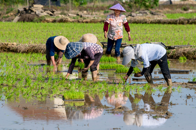 4月24日,金華市婺城區(qū)蔣堂鎮(zhèn)洪村田間地頭,農(nóng)民在搶農(nóng)時(shí)忙插早稻秧苗。谷雨節(jié)氣剛過,正是水稻栽種的好時(shí)機(jī),但受疫情影響,大型農(nóng)機(jī)和操作人員難以進(jìn)入,機(jī)械化種糧進(jìn)程受阻。為不耽擱農(nóng)時(shí),當(dāng)?shù)胤N糧大戶組織人力進(jìn)行早稻插秧。(胡肖飛)