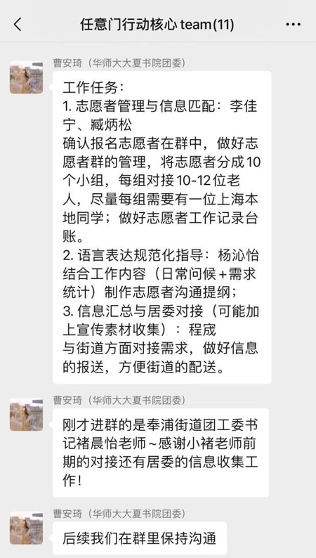 項(xiàng)目啟動(dòng)當(dāng)晚,合作雙方即建立行動(dòng)核心team微信群,大夏書院志愿者總隊(duì)和小區(qū)在地志愿者小分隊(duì)也同步建立子微信群,統(tǒng)一行動(dòng)指南,明確責(zé)任分工,過濾重復(fù)信息,提高老年人緊急需求的處置效率。