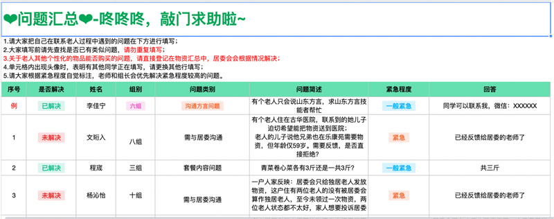 在溝通過程中,志愿者時(shí)常遇到語言不通、交流不暢等問題,他們用耐心努力克服困難。2020級(jí)翻譯專業(yè)的方可昕在溝通過程中收到了丁女士的求助,她的奶奶98歲高齡,獨(dú)居家中,因?yàn)槔先艘暳?、聽力都有障礙,也不會(huì)使用電子設(shè)備,家人非常擔(dān)心……丁女士聲音哽咽,方可昕感到揪心。她一邊安撫丁女士,記錄需求,并在文檔中標(biāo)注為“非常緊急”。情況提供到“核心team”微信群后,小區(qū)在地志愿者陳天瑋立即趕往現(xiàn)場,大約十分鐘就收到了反饋:老人安全無恙。為了更加詳細(xì)了解老人的情況,方可昕與丁女士共通了9次電話。