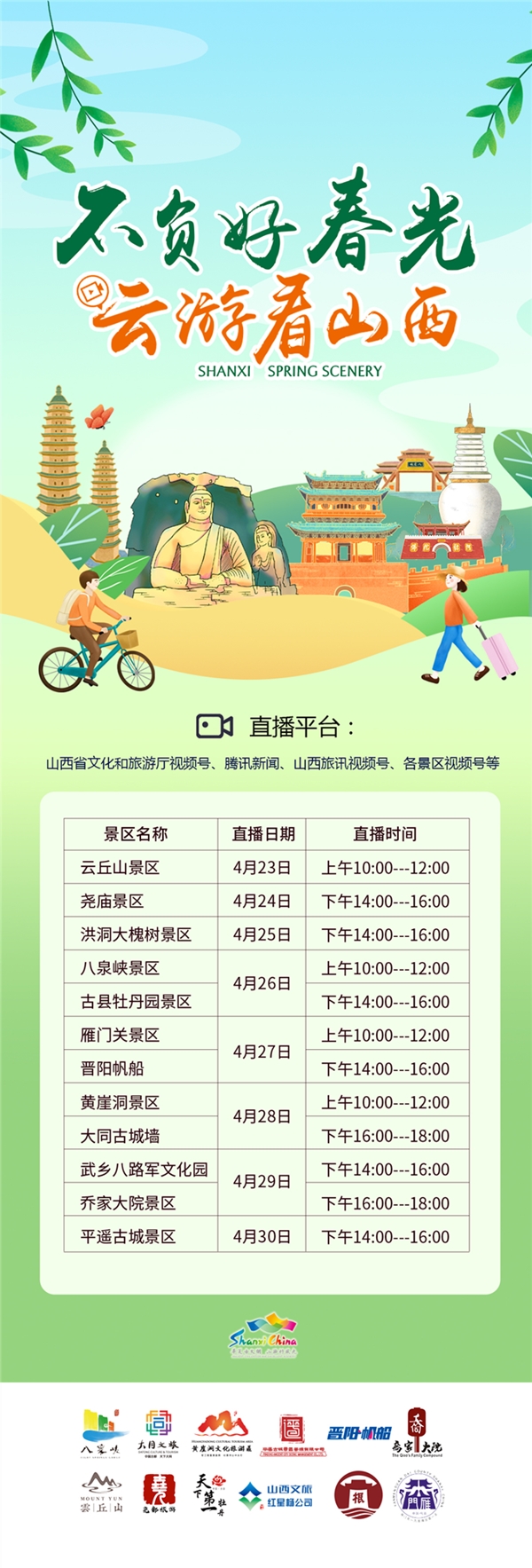 據(jù)了解,本次直播活動(dòng)共有12家山西景區(qū)參與,包括平遙古城、云丘山景區(qū)、八泉峽景區(qū)、洪洞大槐樹景區(qū)、雁門關(guān)景區(qū)5家5A級(jí)景區(qū),以及堯廟景區(qū)、黃崖洞景區(qū)、武鄉(xiāng)八路軍文化園、古縣牡丹文化園、大同古城墻在內(nèi)的5家4A級(jí)景區(qū),還有喬家大院景區(qū)、晉陽(yáng)帆船體驗(yàn)項(xiàng)目的加入,為本次直播活動(dòng)增添了別樣的趣味。直播活動(dòng)將從4月23日開始持續(xù)到4月30日,每天上午10:00—12:00、下午14:00—16:00、16:00—18:00,共3個(gè)時(shí)間段進(jìn)行景區(qū)重點(diǎn)旅游資源推介、春季踏青賞花線路、以及城市周邊游等主題產(chǎn)品介紹。