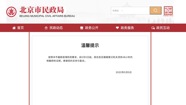 人民網(wǎng)北京5月7日電 據(jù)北京市民政局官網(wǎng)消息,按照北京市最新疫情防控要求,自5月5日起,前往各區(qū)婚姻登記機(jī)關(guān)須持48小時(shí)內(nèi)核酸陰性證明。