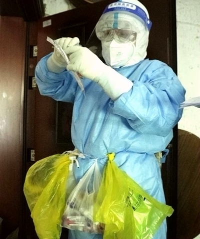 5月2日早上9點(diǎn)不到,劉彩麗來到小區(qū)門口,穿戴好防護(hù)服,腰上綁好采樣工具包、消毒用具,進(jìn)入封控區(qū)為居民進(jìn)行核酸采樣。小區(qū)是5層的老舊樓房,沒有電梯,裹著防護(hù)服的劉彩麗爬上頂樓時已經(jīng)氣喘吁吁,倚著欄桿平穩(wěn)了一下呼吸,輕輕敲著居民門,準(zhǔn)備投入采樣工作。經(jīng)過多輪核酸采樣,劉彩麗和居民早已熟稔。