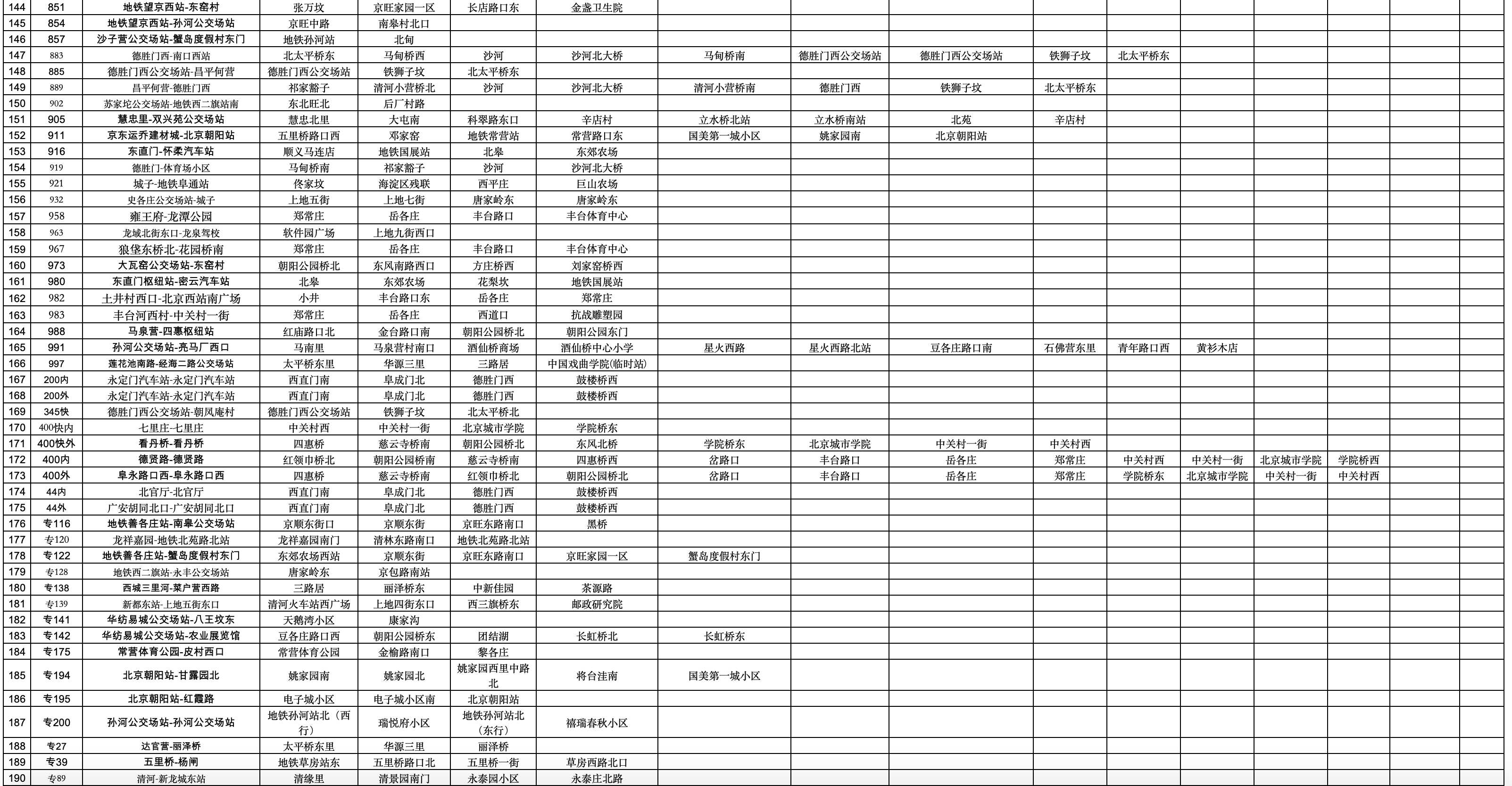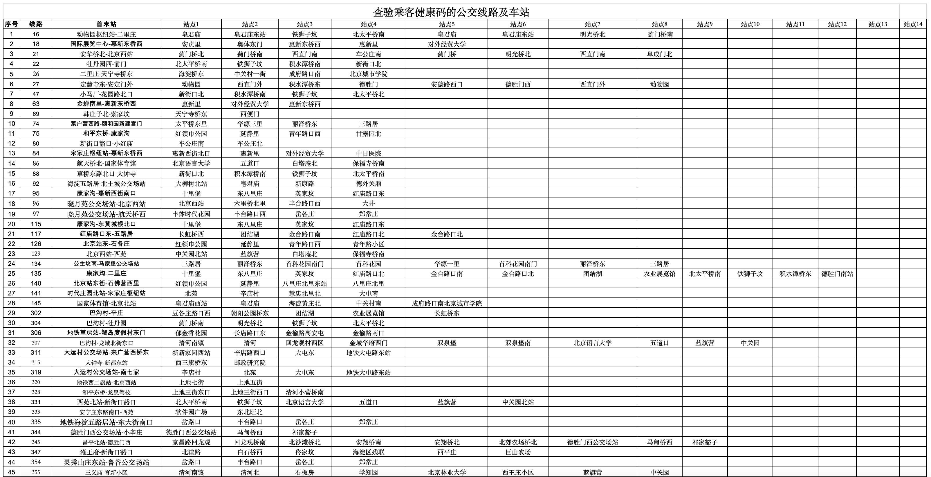人民網(wǎng)北京5月16日電 (池夢蕊)根據(jù)北京市疫情防控需要,為做好精細(xì)精準(zhǔn)防控,自2022年5月17日首班車起,北京市疫情防控封控區(qū)、管控區(qū)周邊的190條地面公交線路重點(diǎn)車站和54座地鐵車站(具體見附表),查驗(yàn)乘客健康碼上車。后續(xù)將結(jié)合北京市疫情防控措施進(jìn)行動(dòng)態(tài)更新。