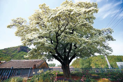 本報(bào)訊(記者 王可心)日前,密云區(qū)新城子鎮(zhèn)蘇家峪村一株古流蘇樹進(jìn)入盛花期,作為北京市屈指可數(shù)的古流蘇樹,不僅因花枝觀賞性強(qiáng)受到民眾喜愛,更因其歷史價(jià)值而被廣泛關(guān)注。據(jù)了解,流蘇樹系北京市二級(jí)保護(hù)野生植物?!拔覀兇暹@株流蘇樹是一級(jí)古樹,據(jù)專家推斷,至今已有近600年歷史。”蘇家峪村黨支部書記王銀江介紹,該樹高約13米,主干到1.3米處分為兩主枝,向上延展成蘑菇形樹冠,平均冠幅約16米?;ㄆ陂_滿潔白的流蘇花,遠(yuǎn)觀如覆霜蓋雪,流蘇細(xì)穗隨風(fēng)搖曳,清香怡人。供圖/密云區(qū)委宣傳部