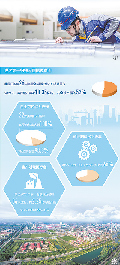自主可控能力更強。22大類鋼鐵產(chǎn)品中,19類自給率達(dá)到100%,其他3類超過98.8%,保障了重大工程重點項目的實施。