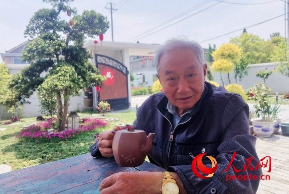 如皋市磨頭鎮(zhèn)十字橋村村民章少華正在自家修剪一新的庭院內品茶。人民網(wǎng)記者 王繼亮攝