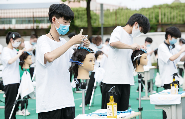 5月17日下午,金華電大(浙江貿(mào)易學校)舉辦2022年技能文化節(jié),該校美容美發(fā)與造型、烹飪、建筑、數(shù)字影像專業(yè)400多名學生,在學校操場上進行職業(yè)技能展示比武,檢驗所學專業(yè)水平。(時寬兵)
