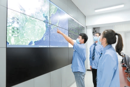 調(diào)度指揮中心人員利用衛(wèi)星云圖進(jìn)行“觀云追雨”分析和降雨量的研判。