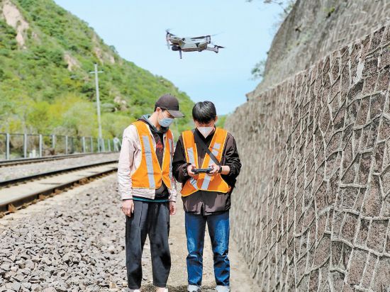 北京工務(wù)段職工利用無人機(jī)對(duì)高大山體等防洪處所進(jìn)行隱患排查。