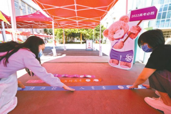 昨天上午,中國地質(zhì)大學附屬中學考點正在進行考點布置工作。兩米線上除了疫情提示,還印有“沉著冷靜 笑對高考”“自信認真 分分必得”等祝福語。本報記者 王海欣攝