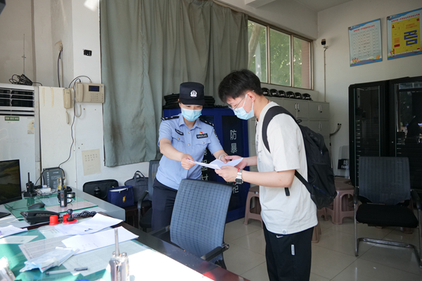 “請他到學(xué)校警務(wù)室,我們馬上采集信息。”對講機(jī)里,傳來了讓這位同學(xué)安心的聲音。在確認(rèn)其身份信息后,正在校警務(wù)室待命的鹽瀆派出所高考考生服務(wù)點(diǎn)民警蔡亞華迅速為其出具了臨時(shí)身份證明。從報(bào)告情況到將臨時(shí)身份證明送達(dá)考生手中,僅用時(shí)5分鐘。