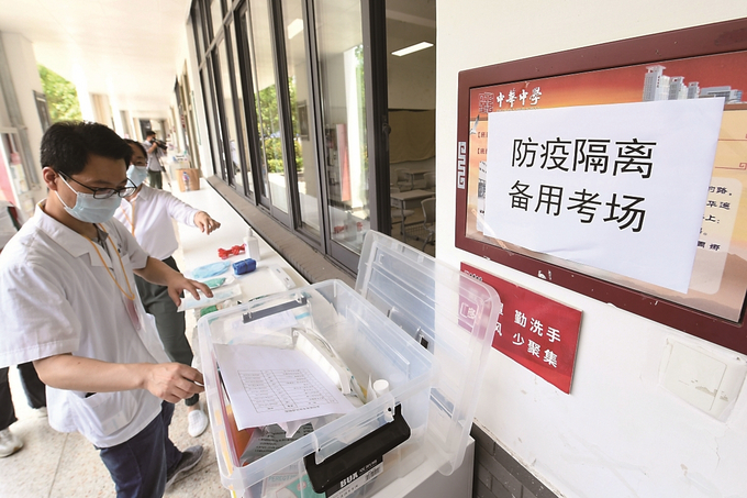 “速干手消毒劑、防護(hù)面屏+護(hù)目鏡、污染物應(yīng)急處置包、紫外線消毒燈車……”在備用隔離考場(chǎng)外,中華中學(xué)考點(diǎn)副主任、防疫副主考單良介紹防疫物資清單。他說(shuō):“考點(diǎn)儲(chǔ)備了考生、考務(wù)人員所需的口罩、含氯消毒劑、速干手消毒劑、紙巾等物品。按文件要求配備5個(gè)備用隔離考場(chǎng)、2個(gè)備用考場(chǎng)。6日前,我們已經(jīng)對(duì)所有考場(chǎng)進(jìn)行預(yù)防性消毒,每天考試結(jié)束對(duì)考場(chǎng)、通道等區(qū)域進(jìn)行常規(guī)消毒,考試期間按要求進(jìn)行開(kāi)窗通風(fēng),責(zé)任到人?!?/p>