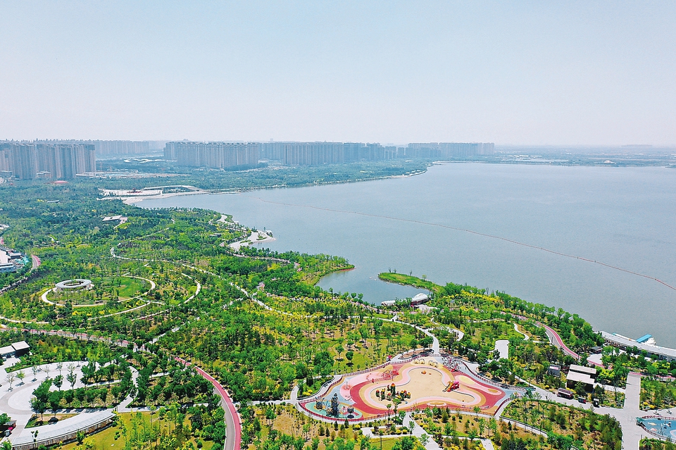 6月12日,太原市晉陽湖北岸,水天一色,綠樹成蔭。優(yōu)美的水岸生態(tài)系統(tǒng)讓公園成為游客夏日親近自然的好去處。(記者阮洋攝)