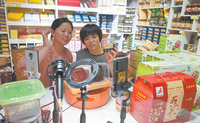 江西鷹潭市余江區(qū)大力推廣網(wǎng)絡(luò)購物、直播帶貨等消費模式,本地茄子干、紅薯粉絲等綠色農(nóng)產(chǎn)品搭上網(wǎng)絡(luò)快車,走上百姓餐桌。圖為余江區(qū)益農(nóng)電商運(yùn)營中心經(jīng)理于小葵(左)在店里直播帶貨。