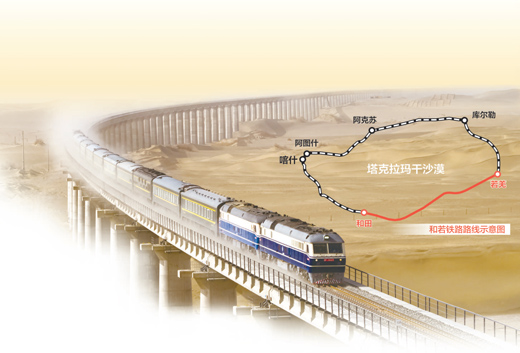 作為國(guó)家重點(diǎn)鐵路建設(shè)項(xiàng)目,和若鐵路西起新疆和田地區(qū)和田市,東至巴音郭楞蒙古自治州若羌縣,全長(zhǎng)825公里,設(shè)計(jì)時(shí)速120公里。和若鐵路開(kāi)通后,與南疆鐵路、格庫(kù)鐵路相連,全長(zhǎng)2712公里,形成世界首個(gè)沙漠鐵路環(huán)線。