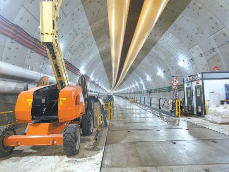 走進(jìn)項(xiàng)目工地,沒(méi)有想象中的機(jī)械轟鳴聲,施工現(xiàn)場(chǎng)位于幾十米深的地下。記者從地面乘坐直梯,順著盾構(gòu)機(jī)始發(fā)井,來(lái)到地下26米處的西線隧道內(nèi)。國(guó)產(chǎn)最大直徑泥水平衡盾構(gòu)機(jī)“京華號(hào)”,已在西線隧道里向前掘進(jìn)了近4000米。眼前的西線隧道,蜿蜒著向南延伸。開(kāi)工初期,記者從始發(fā)井步行幾分鐘即可抵達(dá)盾構(gòu)機(jī)駕駛艙位置;這次采訪,施工方特意安排了1輛純電動(dòng)代步車?!艾F(xiàn)在盾構(gòu)機(jī)離始發(fā)井有些遠(yuǎn),工作人員上下班都得坐車。”駕駛員說(shuō),這輛電動(dòng)代步車是用吊車吊到隧道內(nèi)的,還特意為它在隧道里安了充電樁,“這輛車再回到地面,就得是隧道貫通的時(shí)候啦!”