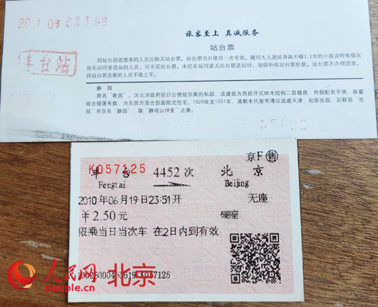 鐵路迷收藏的老豐臺(tái)站車(chē)票及站臺(tái)票。 人民網(wǎng) 李博攝