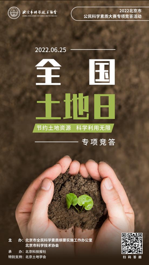 人民網(wǎng)北京6月28日電 土壤是生命之基,土地是生存之本,土質(zhì)是生民之命。關(guān)于孕育萬物的“土地”,您了解多少?日前,北京市全民科學(xué)素質(zhì)綱要實施工作辦公室、北京市科學(xué)技術(shù)協(xié)會聯(lián)合北京土地學(xué)會共同開展“節(jié)約土地資源 科學(xué)利用無限”專項競答活動。