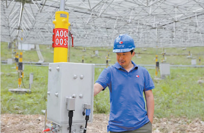 姜鵬在“中國天眼”現(xiàn)場(chǎng)檢查保動(dòng)器的運(yùn)行情況。