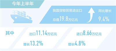 本報北京7月13日電?。ㄓ浾叨藕?jù)海關統(tǒng)計,今年上半年我國貨物貿(mào)易進出口總值19.8萬億元,同比增長9.4%。其中,出口11.14萬億元,增長13.2%;進口8.66萬億元,增長4.8%。