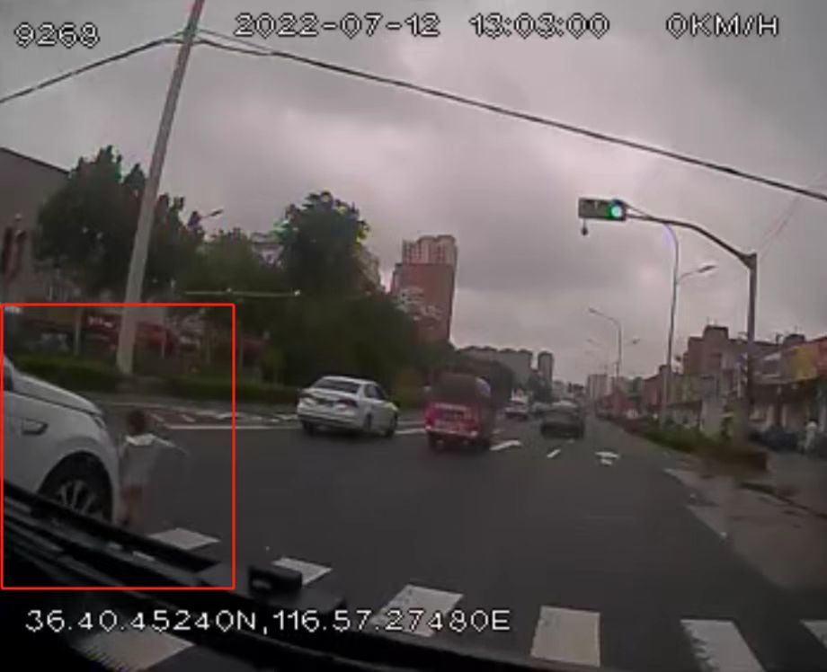 車(chē)載監(jiān)控畫(huà)面顯示,路口正值綠燈,一位4歲左右的兒童突然從斑馬線上跑出,橫穿馬路。危急時(shí)刻,開(kāi)在道路最右側(cè)車(chē)道的濟(jì)南公交B120路駕駛員張濱迅速踩下剎車(chē),在公交車(chē)停下的同時(shí),張濱為提醒其它車(chē)輛注意到在駕駛視線盲區(qū)的兒童,趕緊將手伸出窗外不停揮舞、呼喊。