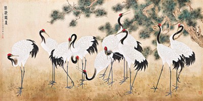 《松齡鶴壽圖》是陳之佛工筆花鳥中尺幅較大的一幅,是為慶祝中華人民共和國成立十周年的獻禮作。10只體態(tài)優(yōu)雅的丹頂鶴,安逸地徜徉于大地之上,或昂首唳天,或回首顧盼,或凝神遠眺,蒼翠的古松由畫面右上方伸入,枝干蒼勁古樸,松枝郁郁蔥蔥,蘊含著無限生機。陳之佛在中國畫傳統(tǒng)線描基礎(chǔ)上,將西洋畫和裝飾畫的線條加以改造后融入其中,使線條的表現(xiàn)力更為豐富。
