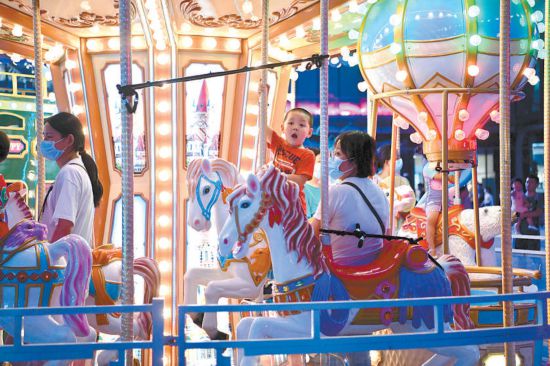 昨晚,北京經(jīng)開區(qū)大族廣場室外區(qū)域熱鬧非常,市民趁著夜色來這里吃飯、購物、游玩,廣場上的游樂設(shè)施前人頭攢動,孩子們在家長陪同下快樂玩耍。本報記者 和冠欣攝