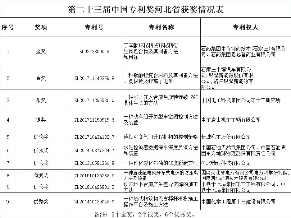近日,國(guó)家知識(shí)產(chǎn)權(quán)局公布關(guān)于第二十三屆中國(guó)專(zhuān)利獎(jiǎng)授獎(jiǎng)的決定,河北省10項(xiàng)專(zhuān)利獲中國(guó)專(zhuān)利獎(jiǎng)。其中,金獎(jiǎng)、銀獎(jiǎng)各2項(xiàng),優(yōu)秀獎(jiǎng)6項(xiàng)。河北省企業(yè)連續(xù)三年獲得中國(guó)專(zhuān)利獎(jiǎng)金獎(jiǎng),金獎(jiǎng)銀獎(jiǎng)獲獎(jiǎng)數(shù)量再創(chuàng)歷史新高。